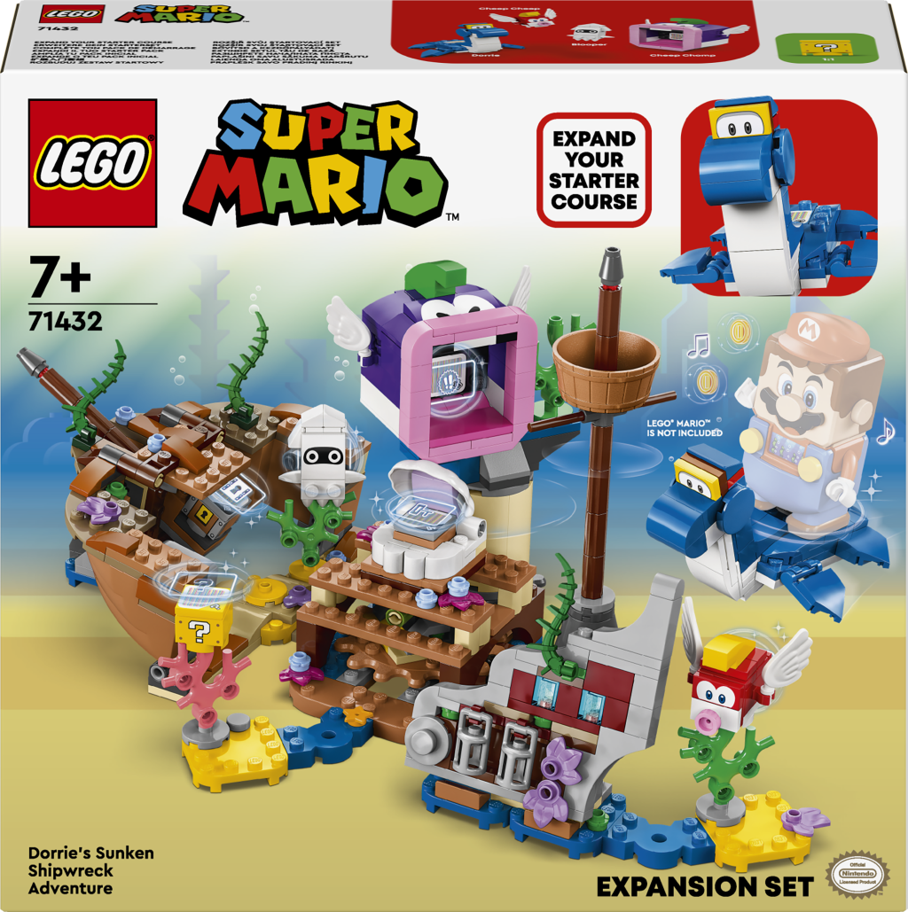 - Rozšiřující set Dorrie a dobrodružství ve vraku lodi – Obohaťte svět LEGO® Super Mario™ o hledání pokladu s tímto sestavitelným vrakem lodi