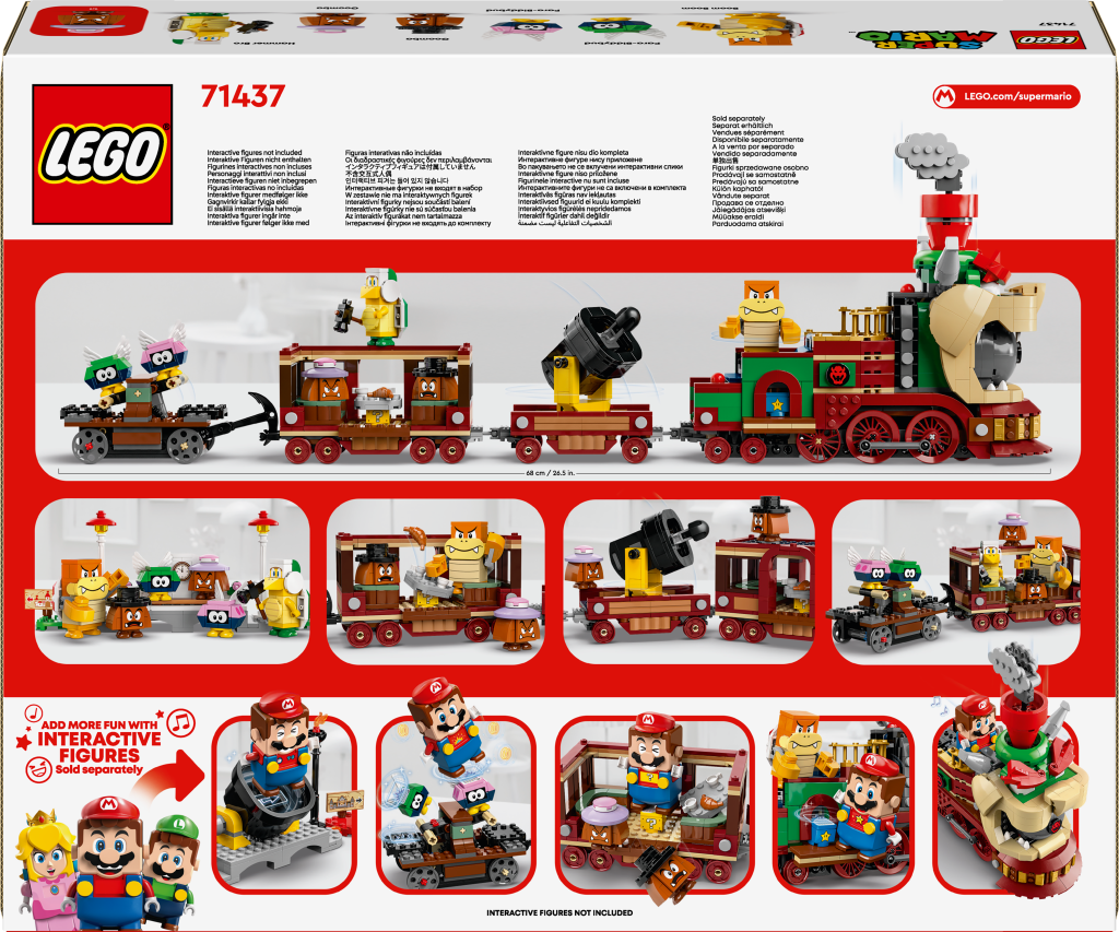 - Rozměry – Tento set Bowserova rychlíku se skládá z 1 392 dílků a měří přes 22 cm na výšku, 68 cm na šířku a 12 cm do hloubky a lze ho zkombinovat s dalšími sety LEGO® Super Mario™ (prodávají se samostatně)