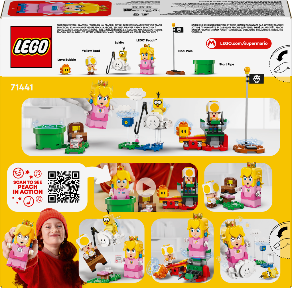 - 4 figurky LEGO® Super Mario™ – Tento set LEGO Nintendo® obsahuje interaktivní figurku LEGO® Peach™ a navíc Lakita, Žlutého Toada a Lava Bubble
