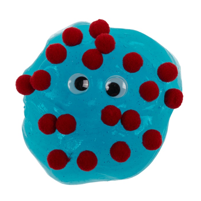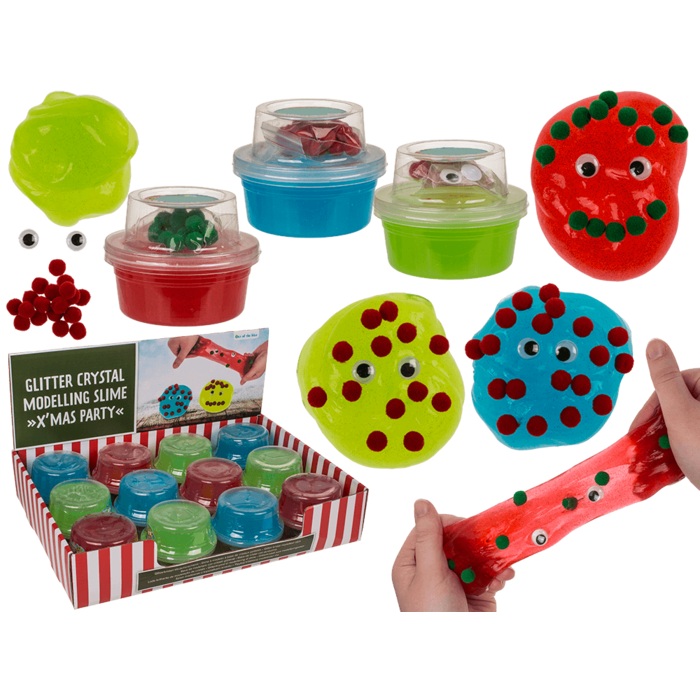 Sliz je pružný a třpytivý. Je dodáván s bambulkami a pohyblivýma očima, takže děti mohou vytvářet zábavné