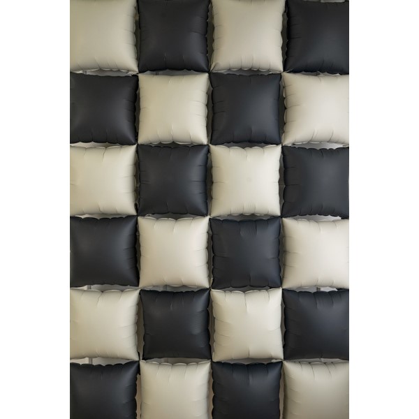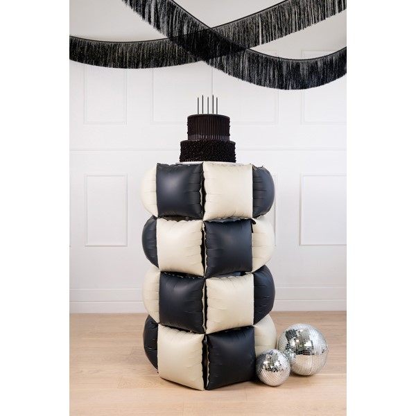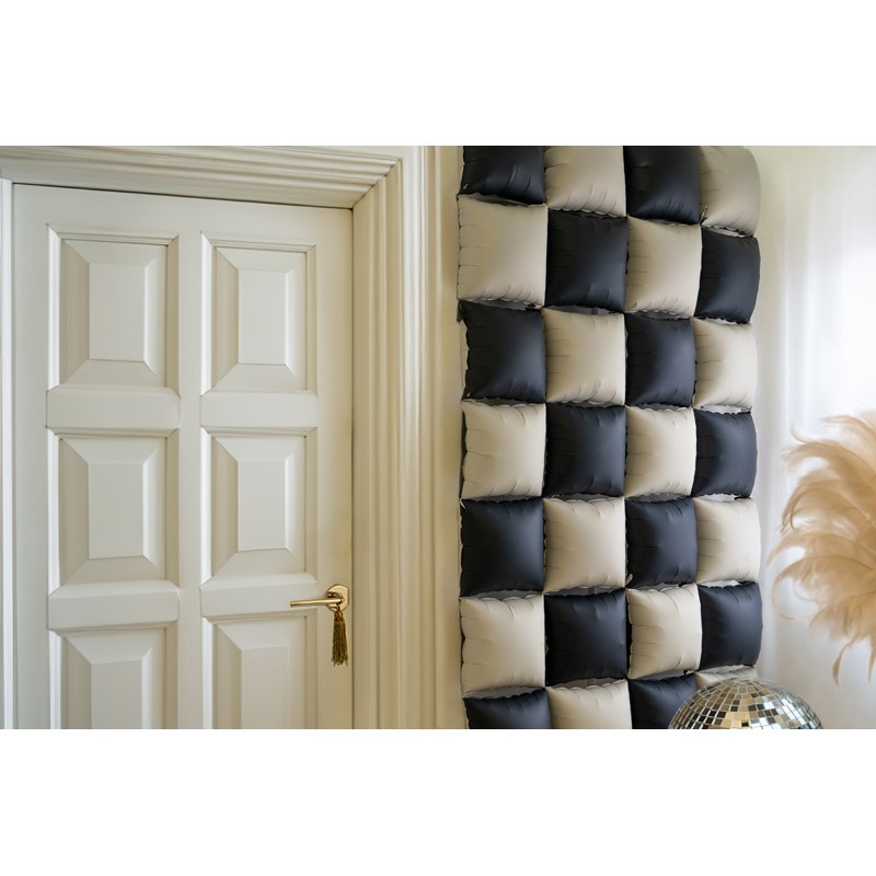 Balónová stěna z černých a béžových čtvercových balónků z hliníkové fólie vytváří vrstvený vizuální efekt.