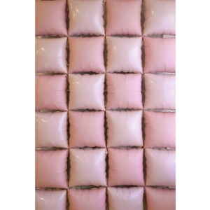 Balónová stěna z růžových čtvercových balónků z hliníkové fólie vytváří vrstvený vizuální efekt.
