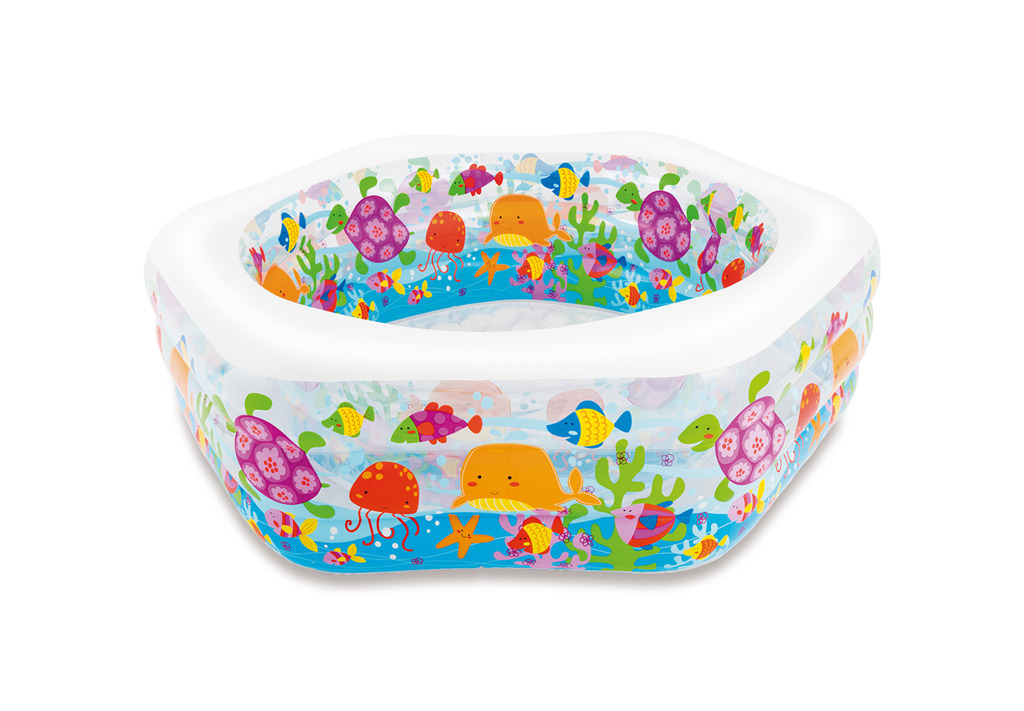 - Bazének pro děti o velikosti 191 cm x 178 cm x 61 cm v designu mořských rybiček. Kapacita vody do 41 cm výšky stěny. Opravná sada přiložena.