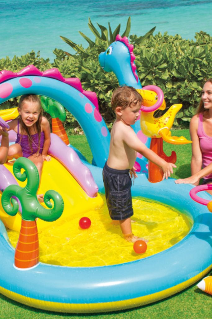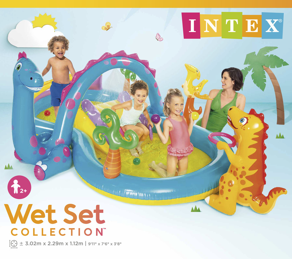 - Krásné nafukovací hrací centrum v designu Dinopark. Ke skluzavce je možnost připojení zahradní hadice pro spršku. Centrum má extra polstrování, v podlaze vypouštěcí ventil.