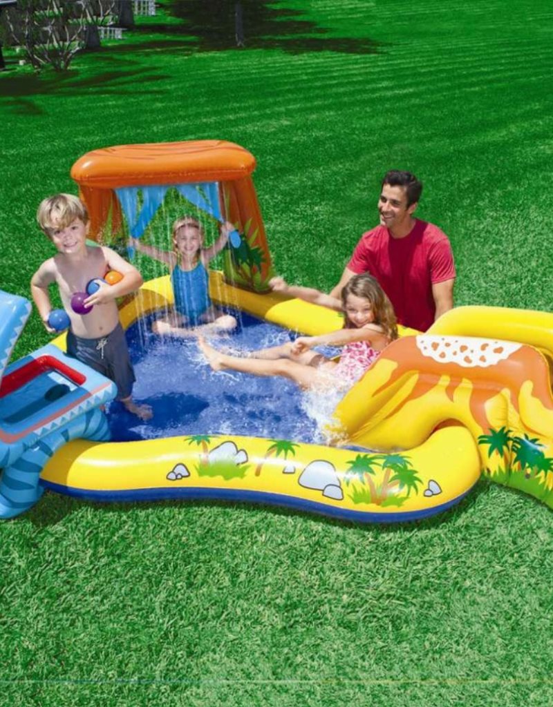 Skvělé hrací centrum v designu dinosaura, se kterým si v horkých letních dnech užiješ spoustu zábavy a osvěžení. Nakrm hladového dinosaura míčky. Možnost zapojení zahradní hadice pro spršku z palmy. Extra polstrování, vypouštěcí ventil v podlaze.