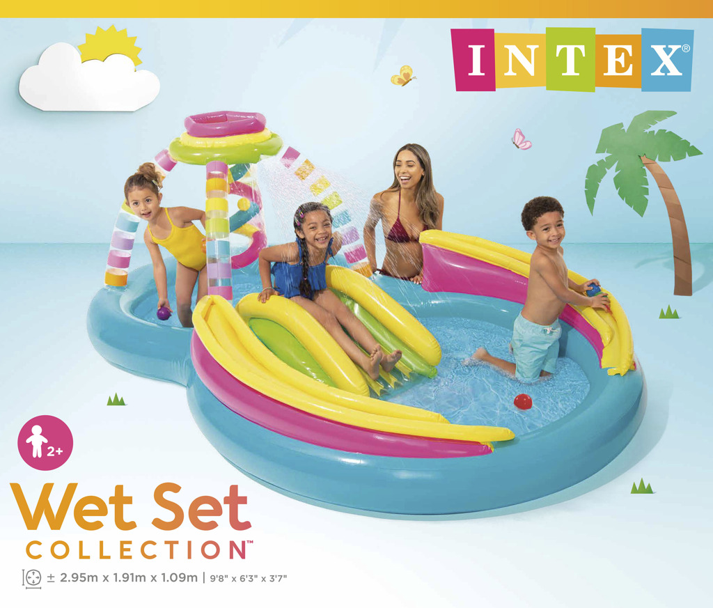 - Skvělé hrací centrum v duhovém designu, se kterým si v horkých letních dnech užiješ spoustu zábavy a osvěžení. Hrací centrum se skluzavkou, sprškou a 6ti míčky v balení. Extra polstrování, vypouštěcí ventil v podlaze. Vyrobeno z testovaného masivního vinylu. Přibližná velikost 295×191×109 cm. Opravná záplata přiložena.