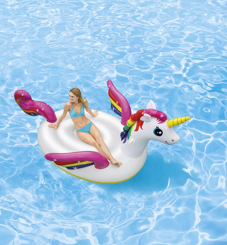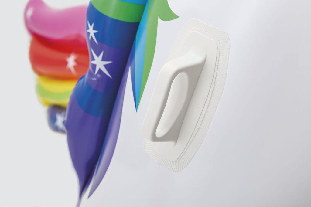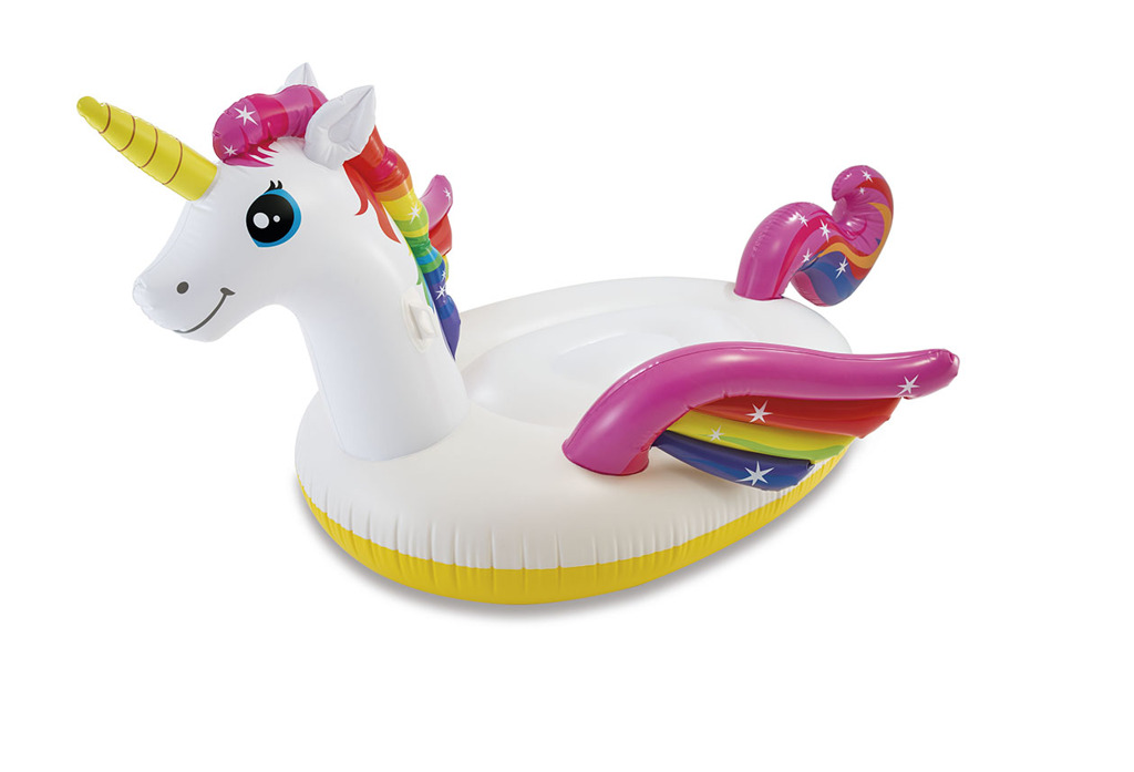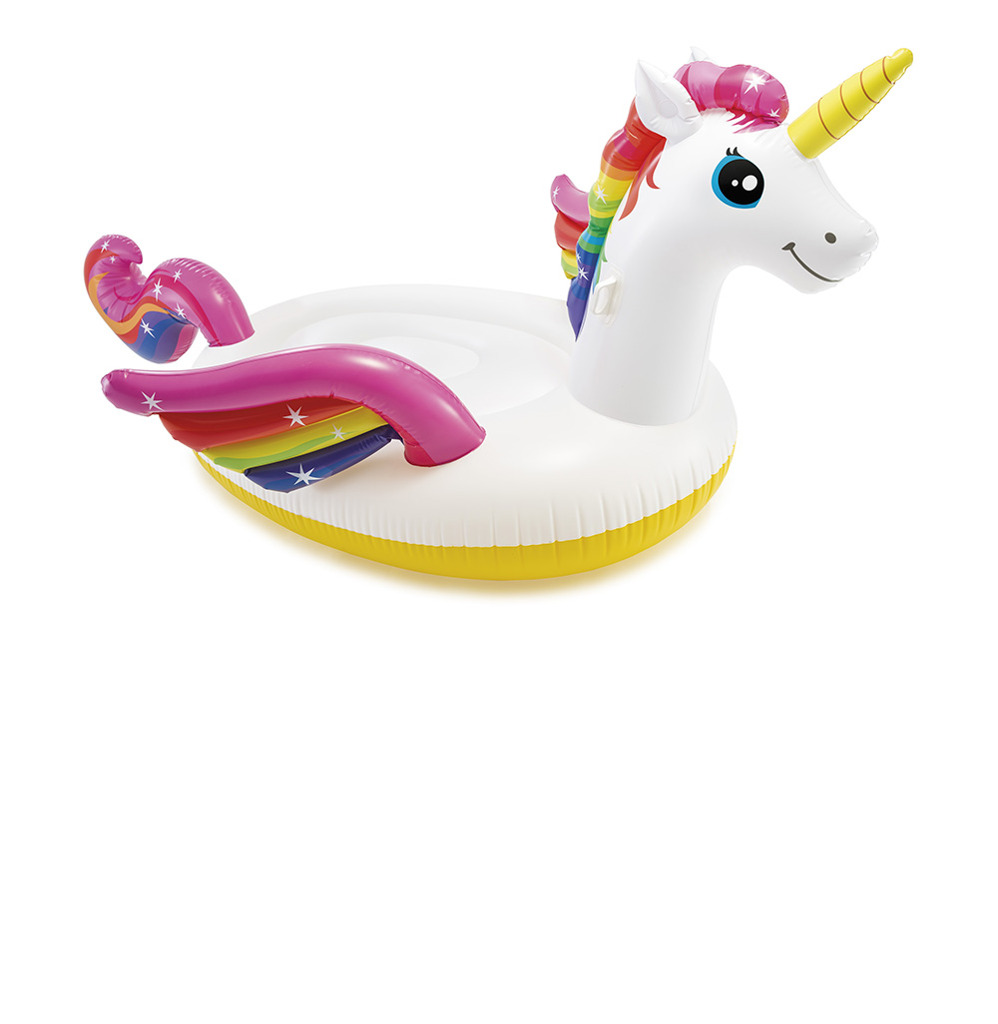 - Maxi nafukovací barevný jednorožec o velikosti 2,87 m x 1,93 m x 1,65 m. Po stranách krku umístněna dvě držadla. 2 vzduchové komory. Opravná záplata přiložena.
