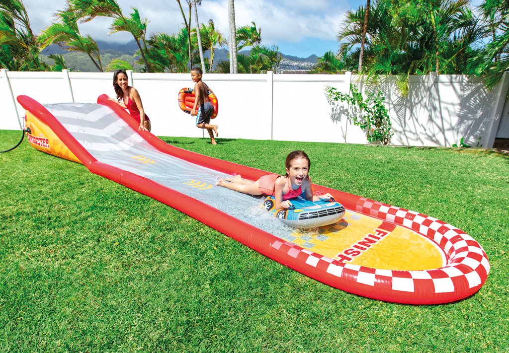 Nafukovací centrum v designu závodní dráhy o rozměrech 5,61 m x 1,19 m x 976 cm. Velká nafukovací závodní dráha. Výrobek obsahuje skluzavku a dvě nafukovací matrace v designu závodních aut. Každá matrace má dvavě pevná madla. Možnost připojení hadice k namáčení kluzné plochy Maximální nosnost je 100 kg. Součástí balení je opravná záplata. Vhodné pro děti od 6 let.