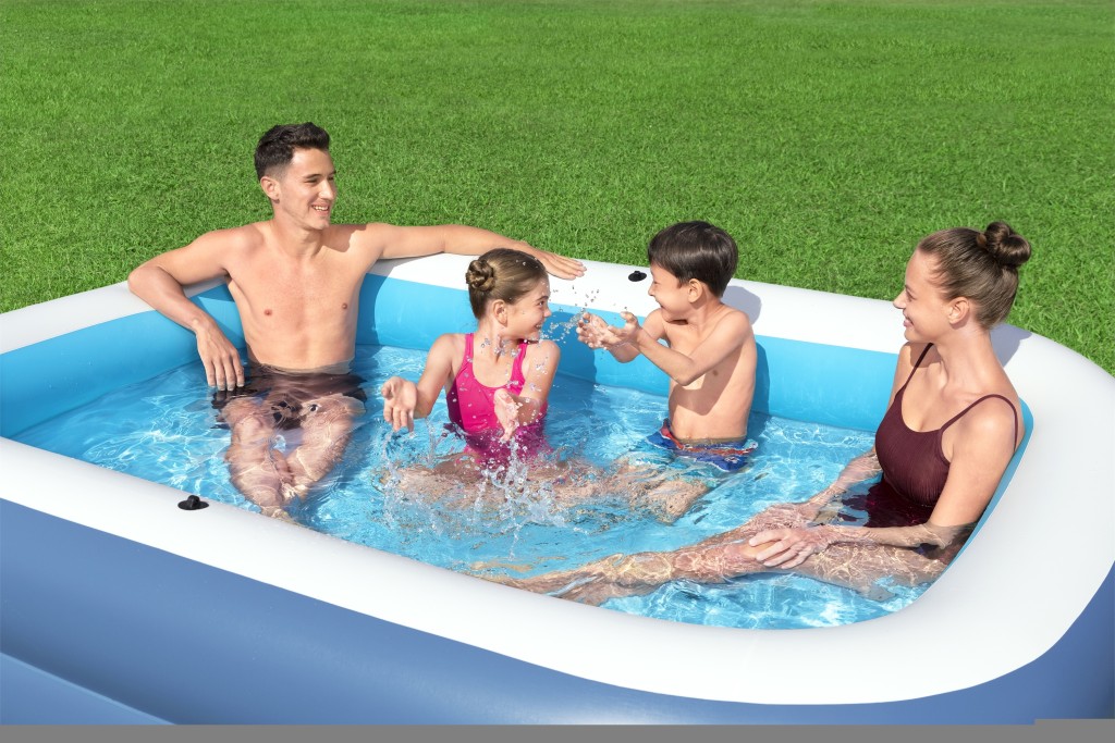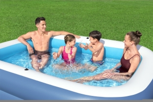 - Obdélníkový rodinný bazén dvoukruhový o velikosti 2,54 m x 1,78 m x 1,40. Součástí je clona proti slunci. Opravná záplata součástí balení. Objem vody je 778 l a bazén má vypouštěcí ventil.