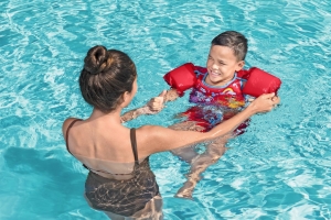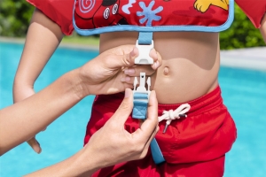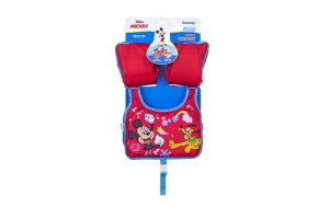 - Plovací vesta s rukávy pro děti od 3 do 6 let o velikosti 56 cm (nosnost 19–30 kg). Veselý design Mickey Mouse, nastavitelná přezka a popruh, odolný zip s automatickým zámkem.