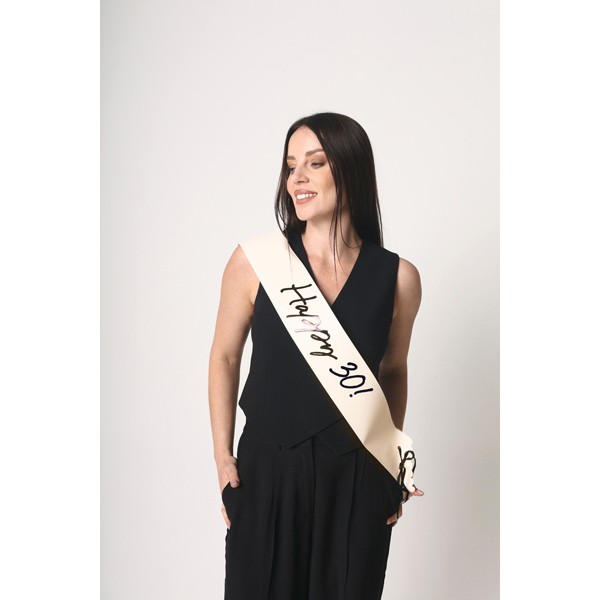 Šerpa je v krémové barvě s černým potiskem čísla 30