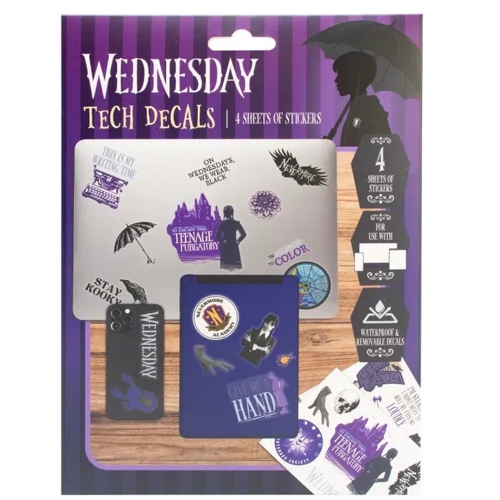 S těmito originálními samolepkami z populárního seriálu Wednesday od Netflixu si můžeš vytunit si svůj notebook, smartphone nebo tablet.