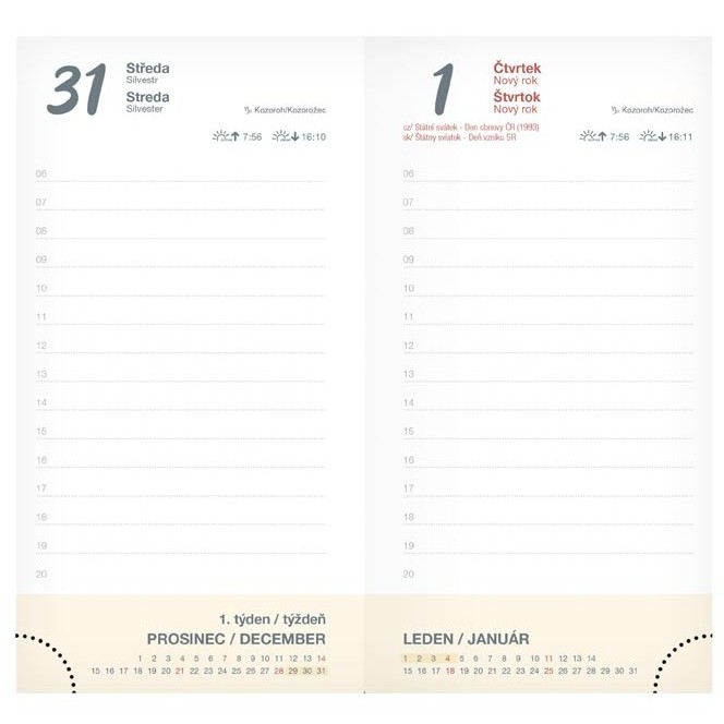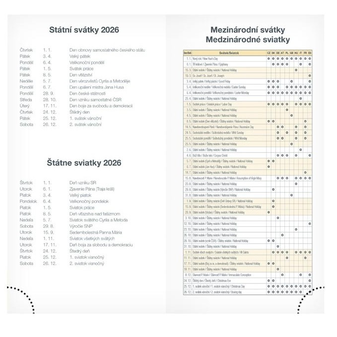 Obálka z matného lamina s parciálním lakem je nejen vizuálně atraktivní, ale také příjemná na dotek a odolná vůči každodennímu používání. Zlaté číslice 2026 decentně vystupují z designu a podtrhují jeho luxusní charakter. Kompaktní velikost umožňuje mít diář stále u sebe. Odtrhávací rožky slouží jako diskrétní vodítko, díky kterému se vždy snadno zorientujete.