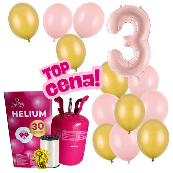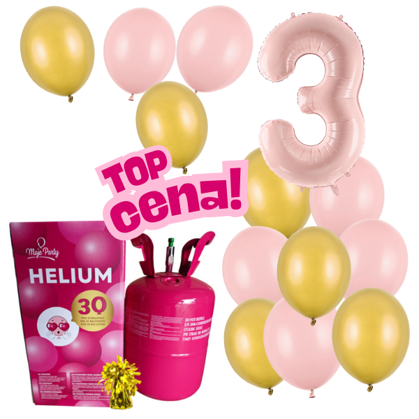 Obsahem setu je foliová číslice 3 o velikosti 86 cm ve světle růžové barvě, 12 ks větších latexových balónků o průměru 30 cm v barvě růžové a zlaté,