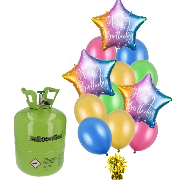 Obsahem setu jsou 3 foliové hvězdy (duhové), 9 ks větších latexových balónků o průměru 30 cm, balónkové těžítko a stužku pro zavázání balónků.