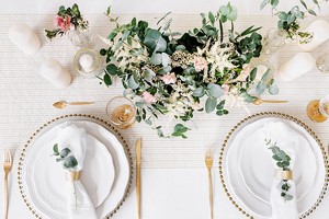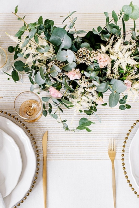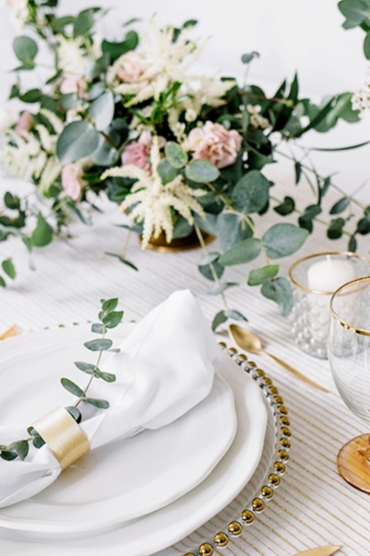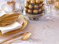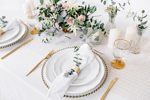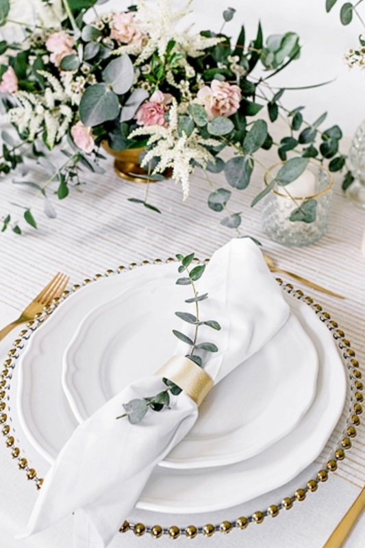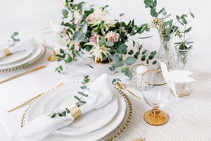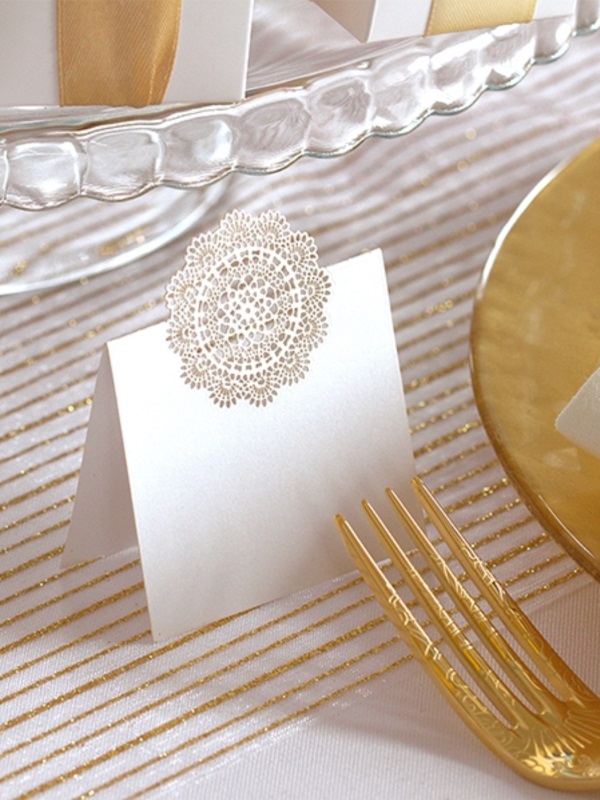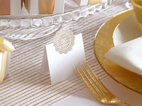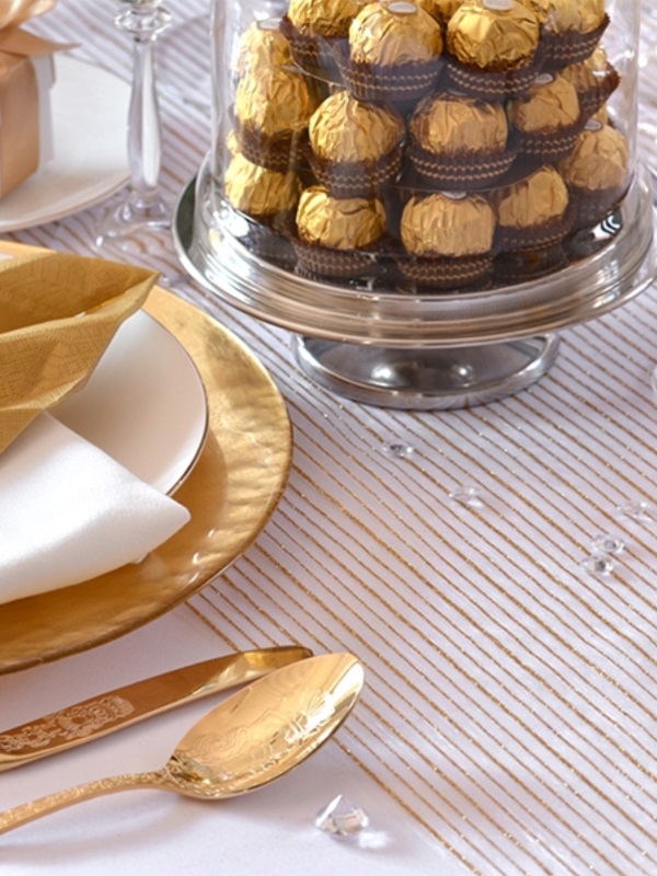 luxusní organza pro slavnostní stolování, vhodné pro elegantní svatební tabule se zlatým dekorem