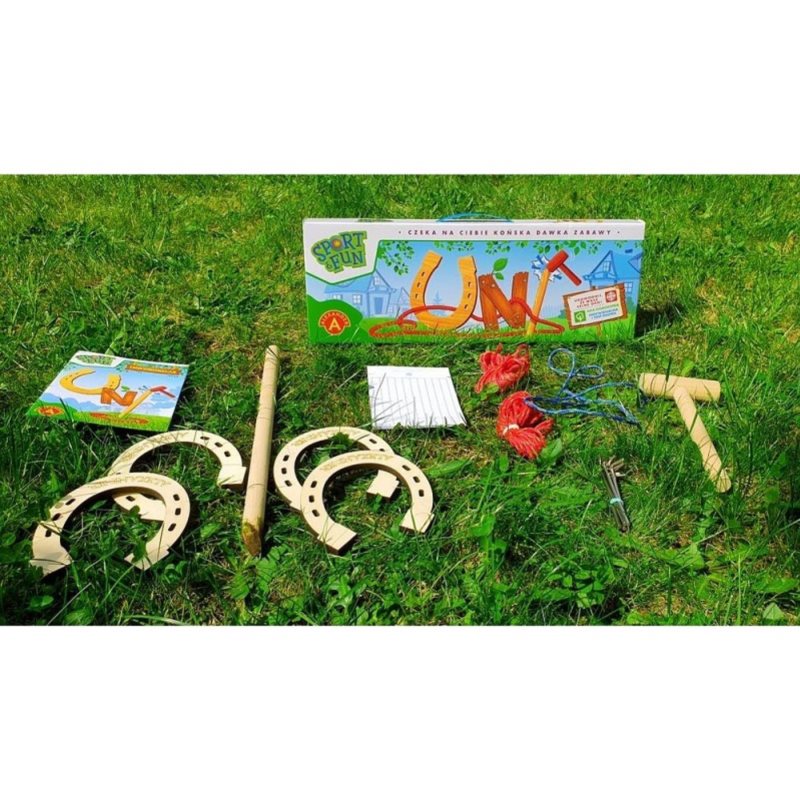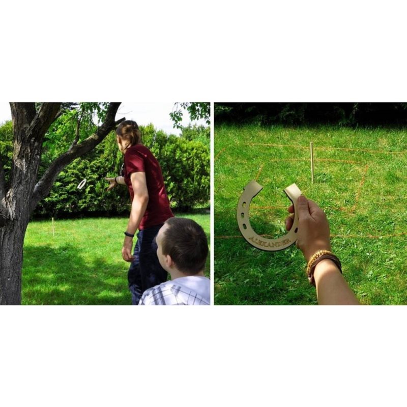 Hra Sport&Fun - Hod podkovou je klasická hra, která prověří vaší zručnost a soustředění. Hraje se v týmech nebo jednotlivě a hráči musí prokázat přesnou mušku, pevnou ruku, dobrý odhad vzdálenosti a.hlavně silné nervy. Navíc k dílům, vyrobených ze dřeva jako jsou kůl, kladivo a 4 podkovy, záskává také dvě různě dlouhá lanka a 8 kolíků pro jejich upevnění. Lanka vymezují dvě další oblasti, kde dopadlá podkova získává body. Čím blíže podkova dopadne ke kolíku, tím více bodů získáte.
