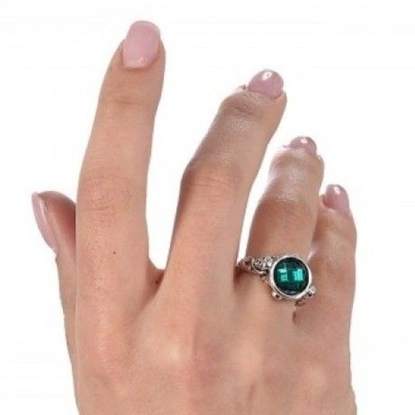 | Stříbrný čarodějnický prsten se zeleným kamenem, ozdobený po stranách hady a lebkami. Prsten je vhodný ke kostýmu … |
