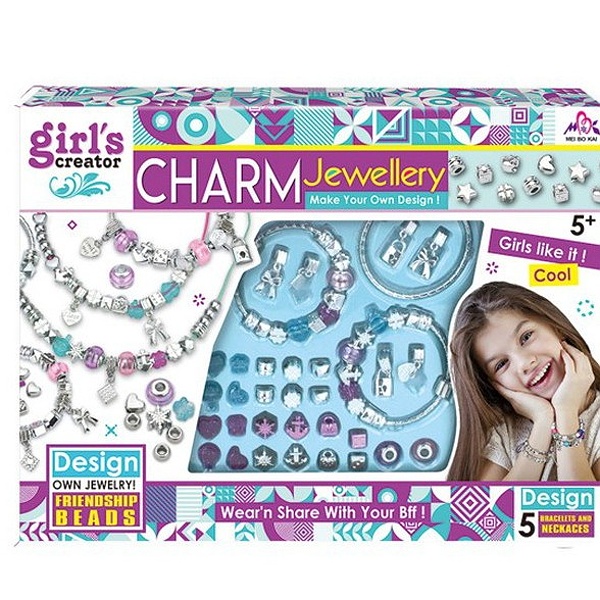 Kreativní sada doplňků, se kterou se dívky mohou pustit do výroby šperků. K dispozici mají barevné korálky a přívěsky se spoustou třpytivých ozdob a přívěšků.