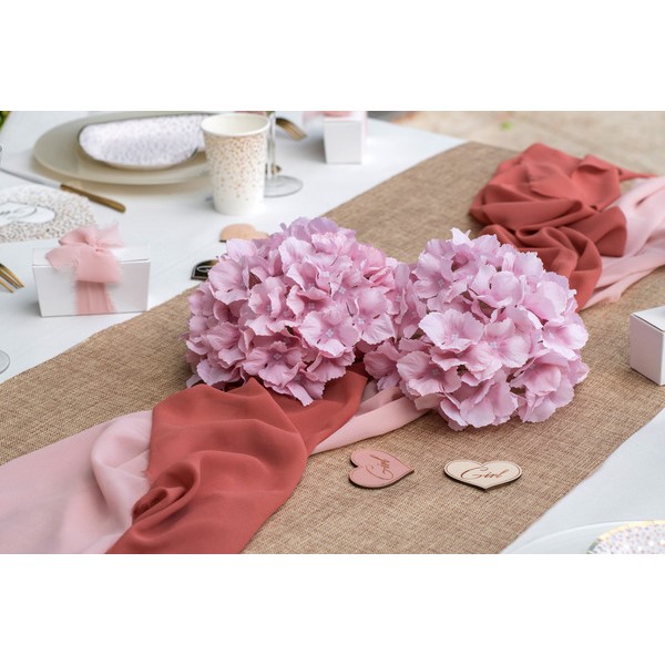Umělá hortenzie je v růžové barvě v bohatém květu a skvěle vynikne především na svatebním stole. Může být umístěna na stolech jako středová výzdoba , viset na stěnách nebo na dveřích, nebo ji použít jako součást svatebního aranžmá.
