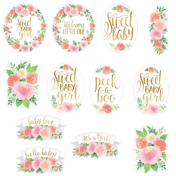Dekorační výřezy Floral Baby Girl lze použít mnoha způsoby na výzdobu tématické párty baby shower