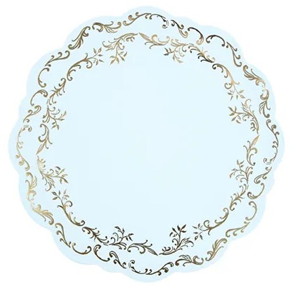 Jednostranné prostírání se zlatým ornamentem ve světle modré barvě.
