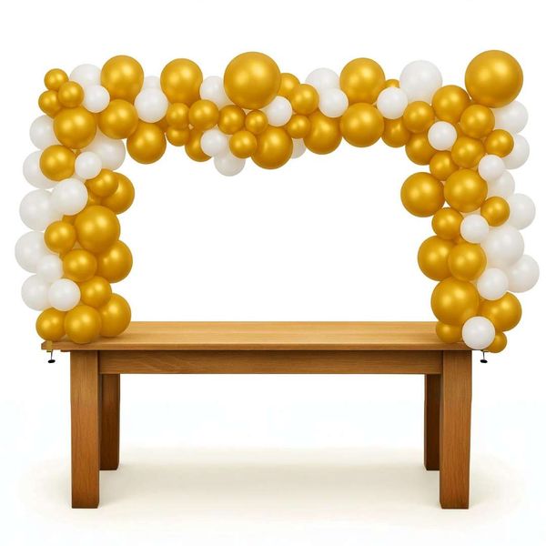 Horizontální zlatý rám na balónky, který lze připevnit ke stolu, je skvělým řešením pro vytvoření krásné a efektní dekorace stolu. Rám má rozměr 260 x 100 cm, což poskytuje dostatek prostoru pro umístění různých dekorativních prvků.