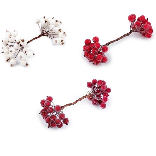 Dekorační umělé bobule v ledu jsou zpestřené drobnými transparentními kuličkami z plastu, které vytvářejí dojem námrazy.