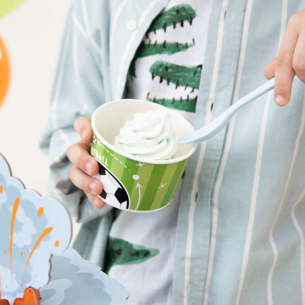 Kelímků na zmrzlinu, sladké nebo slané občerstvení, s motivem fotbalu.