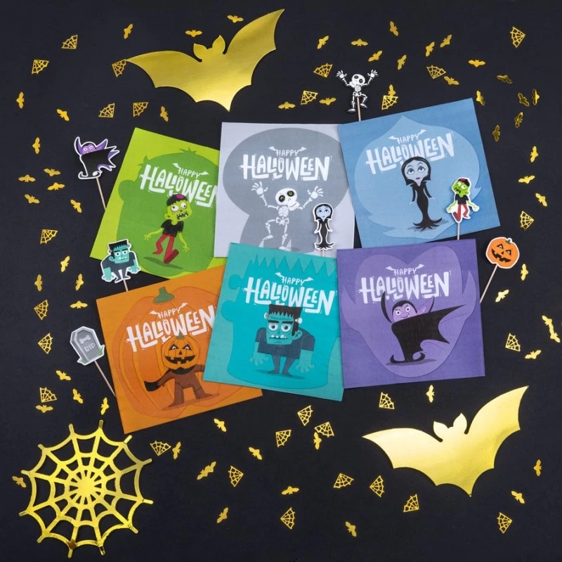 Velmi originální a praktické papírové ubrousky s motivy Frankensteina, dýně, kostlivce, upíra, zombie a upíra, které vám krásně ozdobí stůl na dětské halloweenské párty.