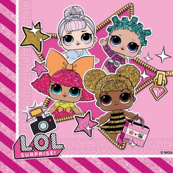 Ubrousky LOL nezapomeňte při stolování na oslavě pro holčičky s parádivými panenkami LOL Surprise.