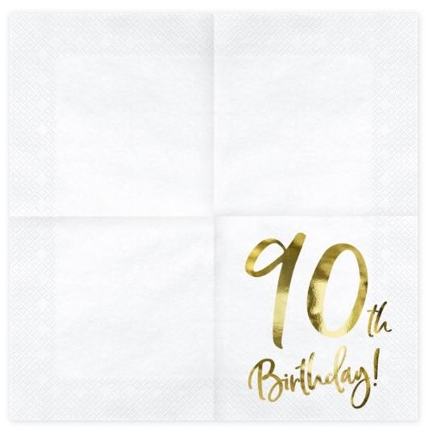 | Bílé 3-vrstvé ubrousky se zlatým nápisem k oslavě jubilejních 90. narozenin Balení obsahuje 20 ks Rozměr : 33 x 33 … |