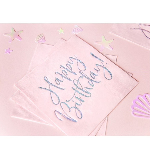 Papírové světle růžové ubrousky s holografickým nápisem Happy Birthday.