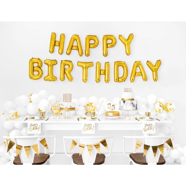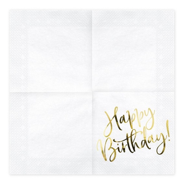 Narozeninové papírové ubrousky jsou v bílé barvě se zlatým nápisem Happy Birthday.