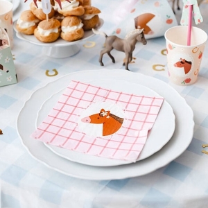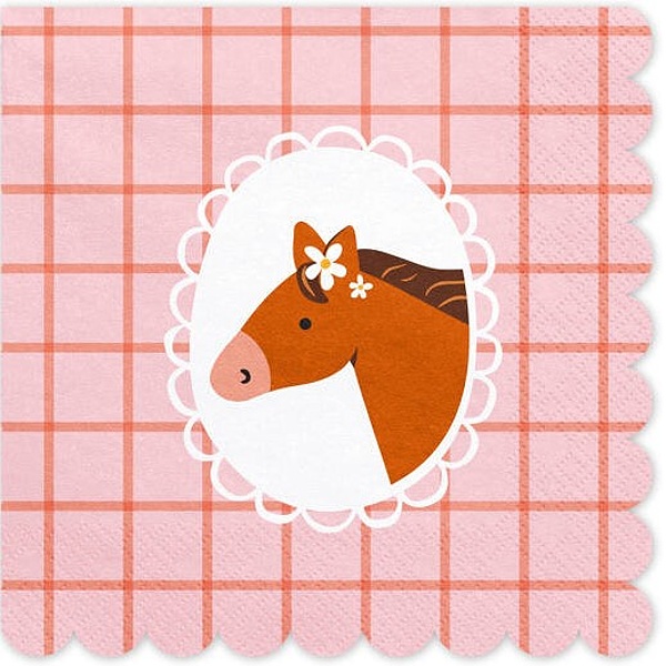 Důležitým doplňkem stolování při pořádání tématické párty Koníci jsou tyto papírové ubrousky s obrázkem koňské hlavy na růžovém podkladu.