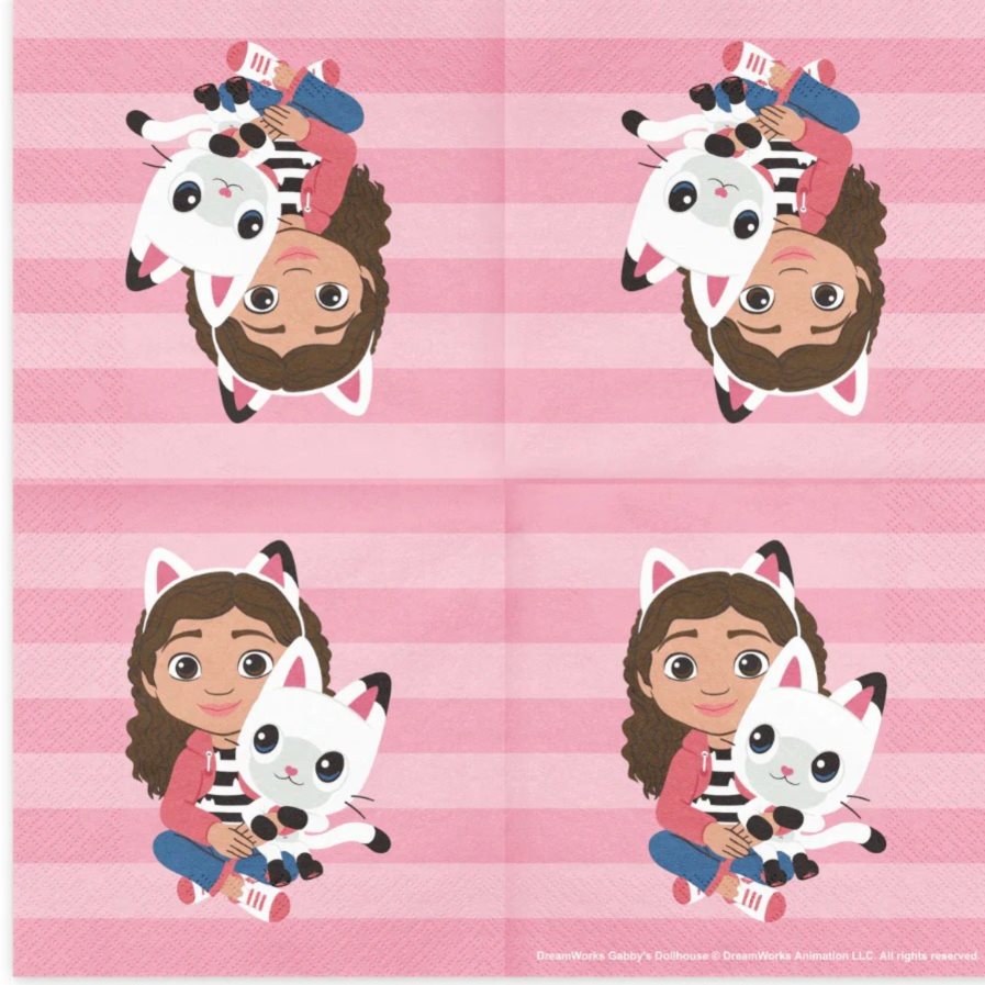 pro malé slečny. Na každém ubrousku je Gabby, milá hostitelka Gabbyina domečku pro panenky, spolu s její kočičí kamarádkou