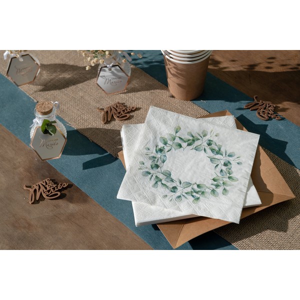 Bílé papírové ubrousky s ilustrací zelených lístečků jsou hezkým doplňkem na tématickou zahradní letní párty, svatby, velikonoce, narozeninové oslavy a k jiným příležitostem.