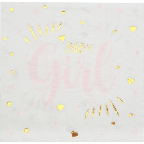 Ubrousky papírové metalické se světle růžovým nápisem Girl a zlatým zdobením nesmíte zapomenout při výzdobě stolu ať už při oslavě narozenin či narození holčičky, tématické párty baby shower nebo jiných příležitostech.