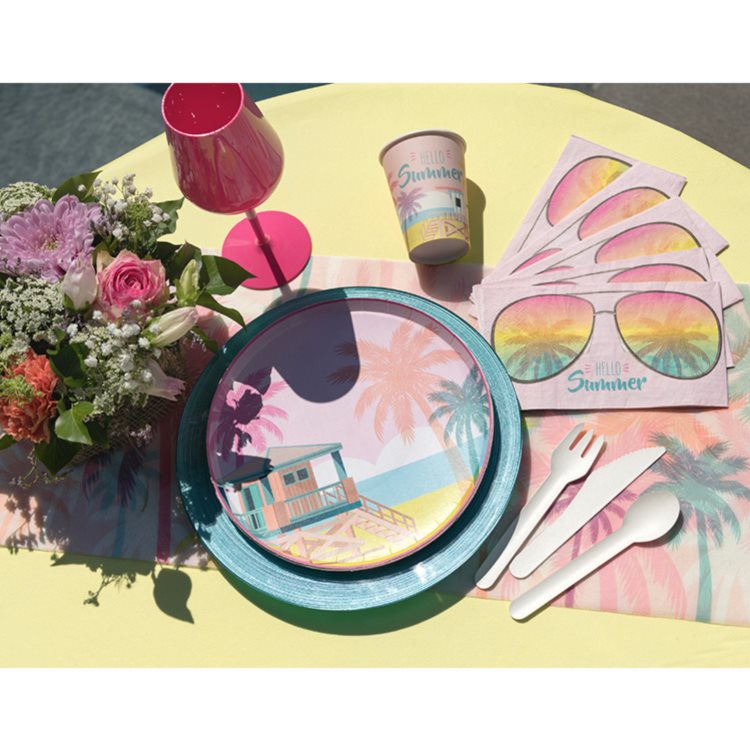 Růžové papírové ubrousky, zdobené slunečními brýlemi v barvě multicolor a s palmami jsou ten pravý doplněk stolování na letní plážovou či tropickou párty s přáteli.