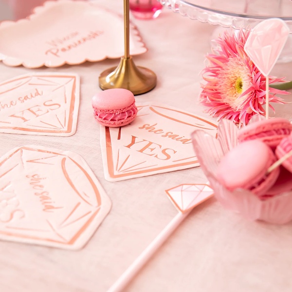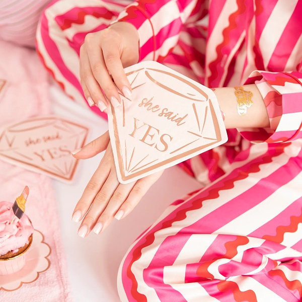 Tyto ubrousky ve tvaru diamantu s nápisem She Said Yes jsou originálním doplňkem stolování na bujaré dámské rozlučce se svobodou.