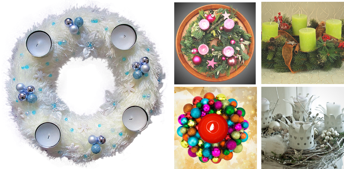 Barevnost svíček je samostatná kapitola. Křesťané v tom mají jasno. Použijí tři kousky v liturgických barvách - tmavomodré nebo fialové a jednu růžovou svíčku přátelství. Ostatní si mohou s barvami trochu hrát. A jak vidíte na obrázku níže, krásně vypadají věnce a svíčky do bíla, zelena nebo opravdu pestrobarevné kousky. Důležité je dobré upevnění svíček! Asi nejlepší variantou jsou držáky na svíčky s bodci, které zapíchnuté ve věnci dobře drží. Kdybyste na ně v obchodě zapomněli, můžete improvizovat. Bude stačit delší hřebík, na který svíčky napíchnete.