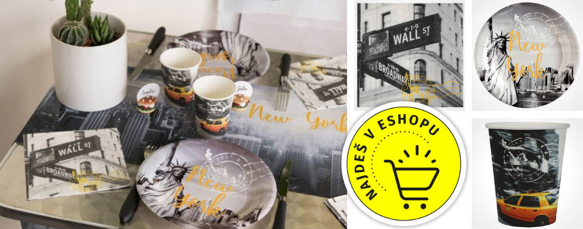 Základ takové party je barevné ladění. Co třeba černá nebo černobílá variace s výraznými doplňky v žluté (jako newyorské taxiky) nebo zlaté? Pak bychom měli začít zlatým ubrusem s černou šerpou a odpovídajícími doplňky jako jsou New York talířky, ubrousky a kelímky ze série světové metropole.