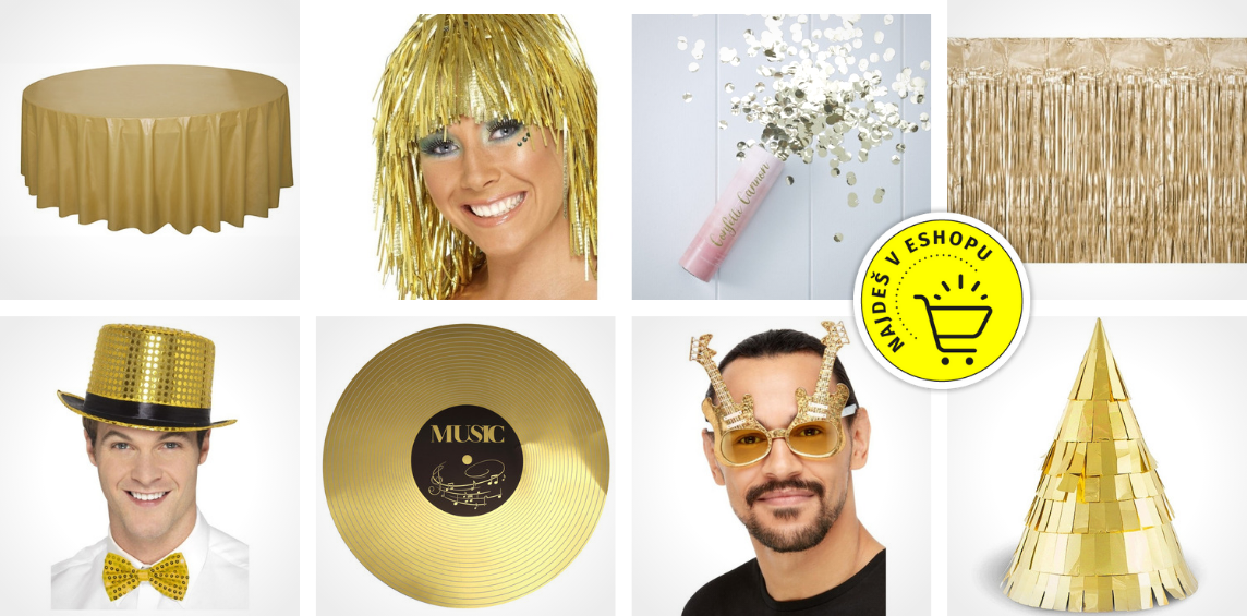 K tomuhle divokému a bláznivému městu zlatá tak nějak patří. Takže k základu, který jsme si popsali v úvodním odstavci, přidáme třeba vážně vypečenou věc – zlatý závěs. Opona ze zlatých proužků bude vypadat prostě báječně. Ať už na zdi, za sweet barem, za tanečním parketem, může oddělovat jednotlivé sektory vaší party a naprosto úžasná je jako pozadí fotokoutku.
