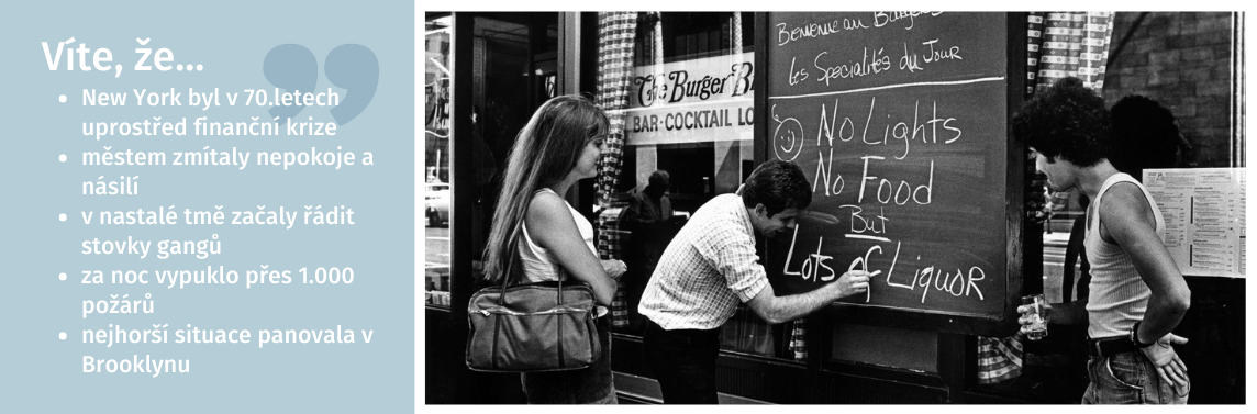 Jestli jste byli v New Yorku v posledních letech na výletě, zapomeňte na to, že takhle vypadalo město v 70. letech. Tehdy to bylo jedno z nejnebezpečnějších míst na světě. Bitky pouličních gangů, násilí, požáry. Tma řádění těchhle drsných partiček jen přikryla. Bylo zatčeno 3400 lidí. A bylo jasné, že až v zářivkách zapraská a znovu se rozsvítí, budou se hlavy pomazané muset zamyslet, co s tímhle přelidněným městem udělat dál.