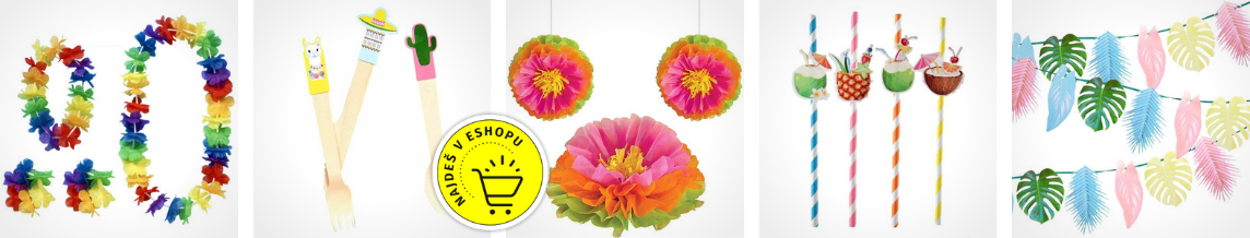 Inspiraci najdete na obrázcích a pak v našem e-shopu, třeba v sekci Happy summer day, Nature Sea Beach - která je k vodě jako stvořená, podobně jako ta Námořnická, Tropical, Fiesta, Flemingo nebo Havajská. Takže pestrobarevná zábava a hodně lam, kaktusů, plameňáků a tak podobně. Nezapomeňte na eko sety a dřevěné příbory, napichovátka nebo brčka!