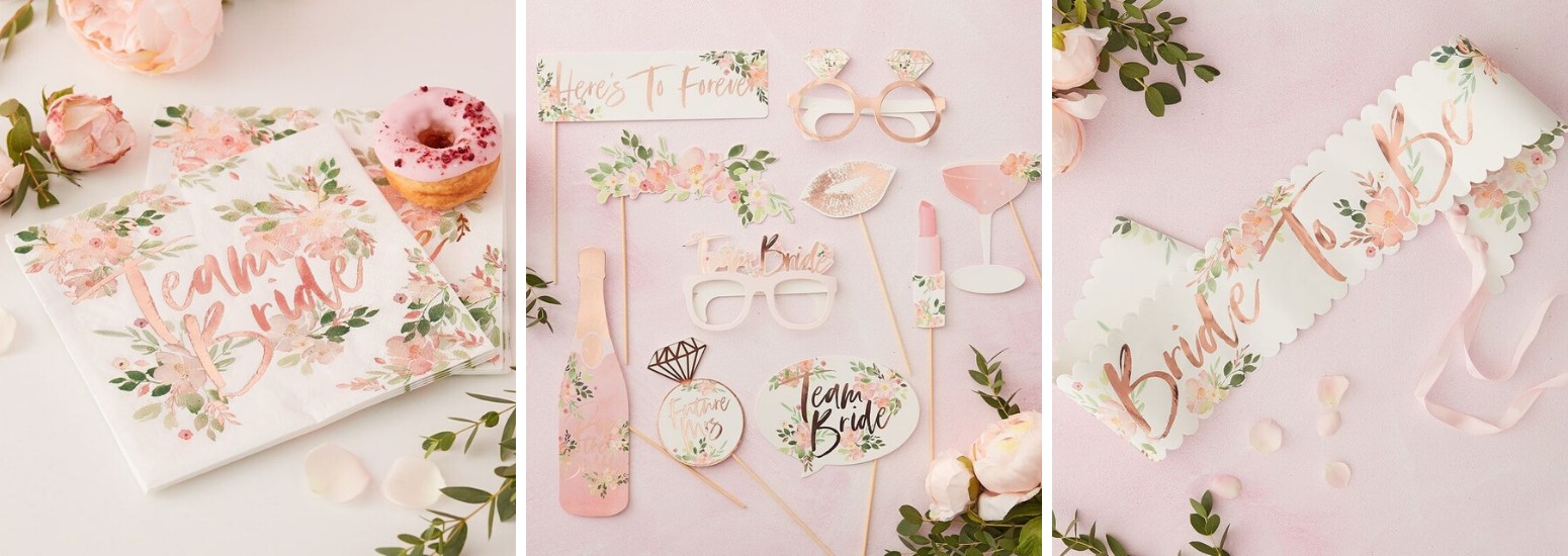 Naše romantická sada má spoustu doplňků, které na rozlučce nesmí chybět. Oblíbené zábavné rekvizity do fotokoutku, květinové šerpy, romantické stolování...