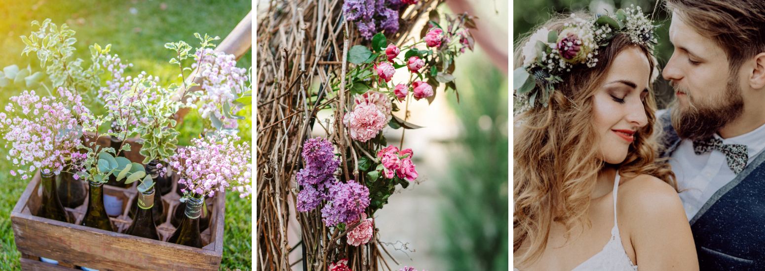 Na eko svatbách by neměli chybět bylinky, luční a zahradní květy v ležérních a rozcuchaných vazbách. Rozpustilé květiny, kde se nehodnotí přesná dokonalost jsou tipem pro svatby, které jsdou ruku v ruce s přírodou.
