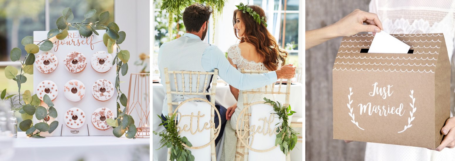 Dřevěné dekorace do eko trendů rozhodně patří. Dozdoibíte s nimi svatební židle i svatební stůl. Patří i na populární sweet bary. Dřevěné podstavce a tabule, na které navěsíte sladké koláčky (donuty) přilákají nejednoho svatebního hosta. Zvláště je ocení ti nejmenší mlsouni. Do papírových schránek pak mohou hosté vkládat nejenom přání, ale i peněžní příspěvky, třeba na společnosu domácnost nebo svatební cestu.