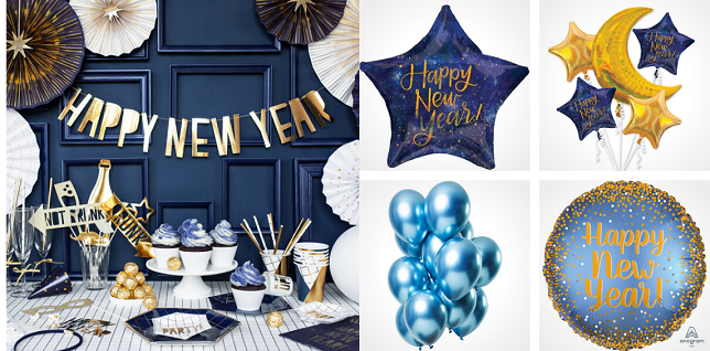 Výzdobou v modrých tónech nic nezkazíte. Je šarmantní, netradiční i decentní zároveň. Po té by měli sáhnout ti, kteří pořádají párty pro více lidí a všechny je třeba ani neznají. Modrou párty prostě nešlápnete vedle, nikoho neuvedete do rozpaků a okouzlíte ho. Víc si prohlédněte v kategorii Blue Gold Silvestr nebo Párty v modré. Tam najdete všechno pěkně pohromadě. Takže my už jen dodáváme, že zvlášť efektně vypadají temně modré rozety, balónky Happy New Year, modrý stojan na skleničky prosecco nebo stylové talíře. Ostatně, většinu toho všeh vidíte na obrázku níže. Není to nádhera?