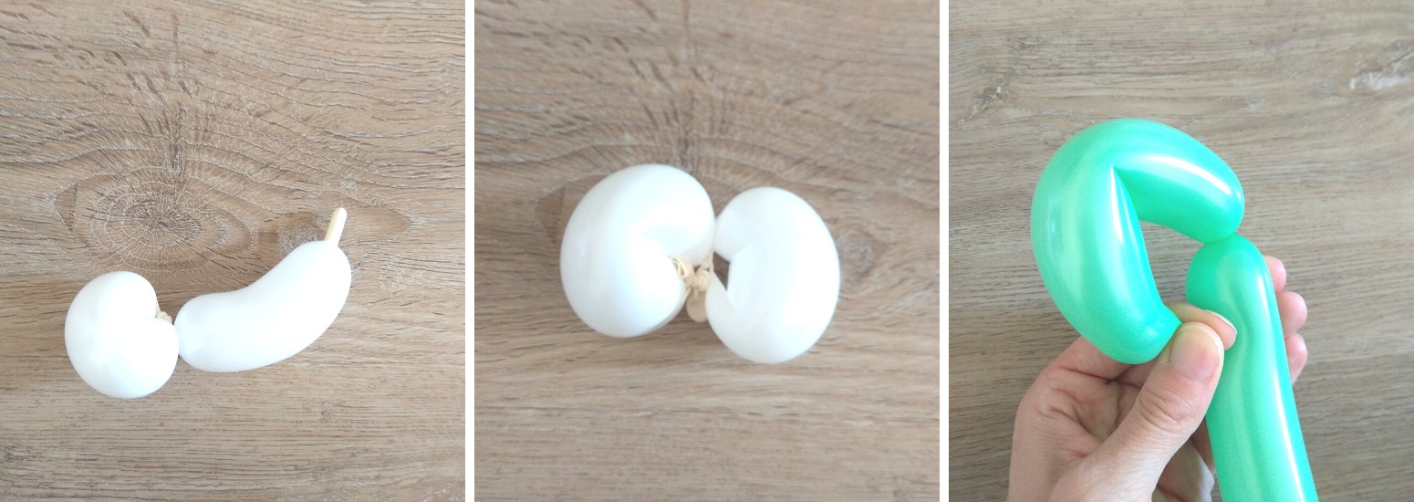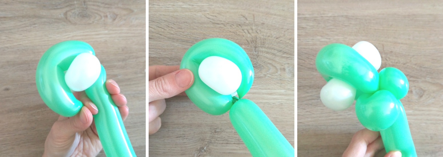 3. Asi 13 cm zelenho balónku zatočíme a zahneme do obloučku, vložíme oči a koncem balónku podvážeme a připevníme.